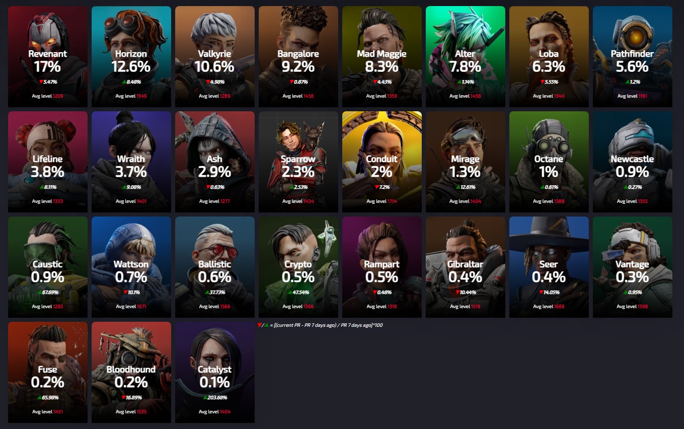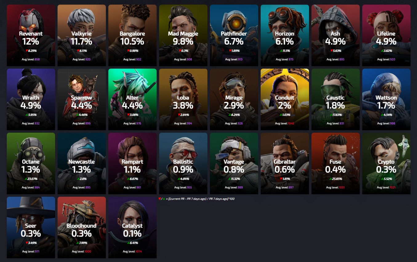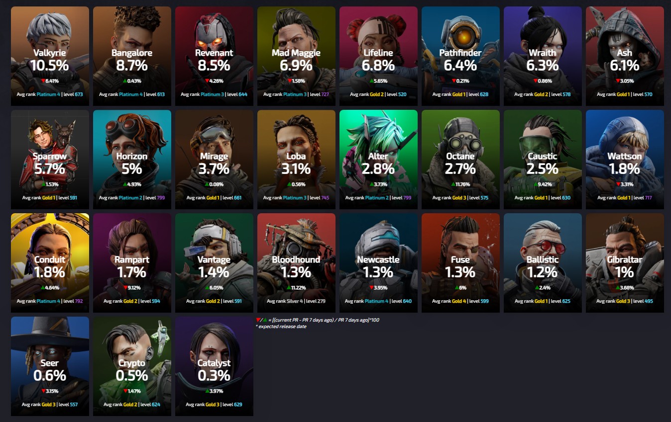 Apexlegendsstatus.comによると約3140万人のプレイヤーによって基づいている『レジェンドの使用率』は現在の下記の様になっているとの事です。