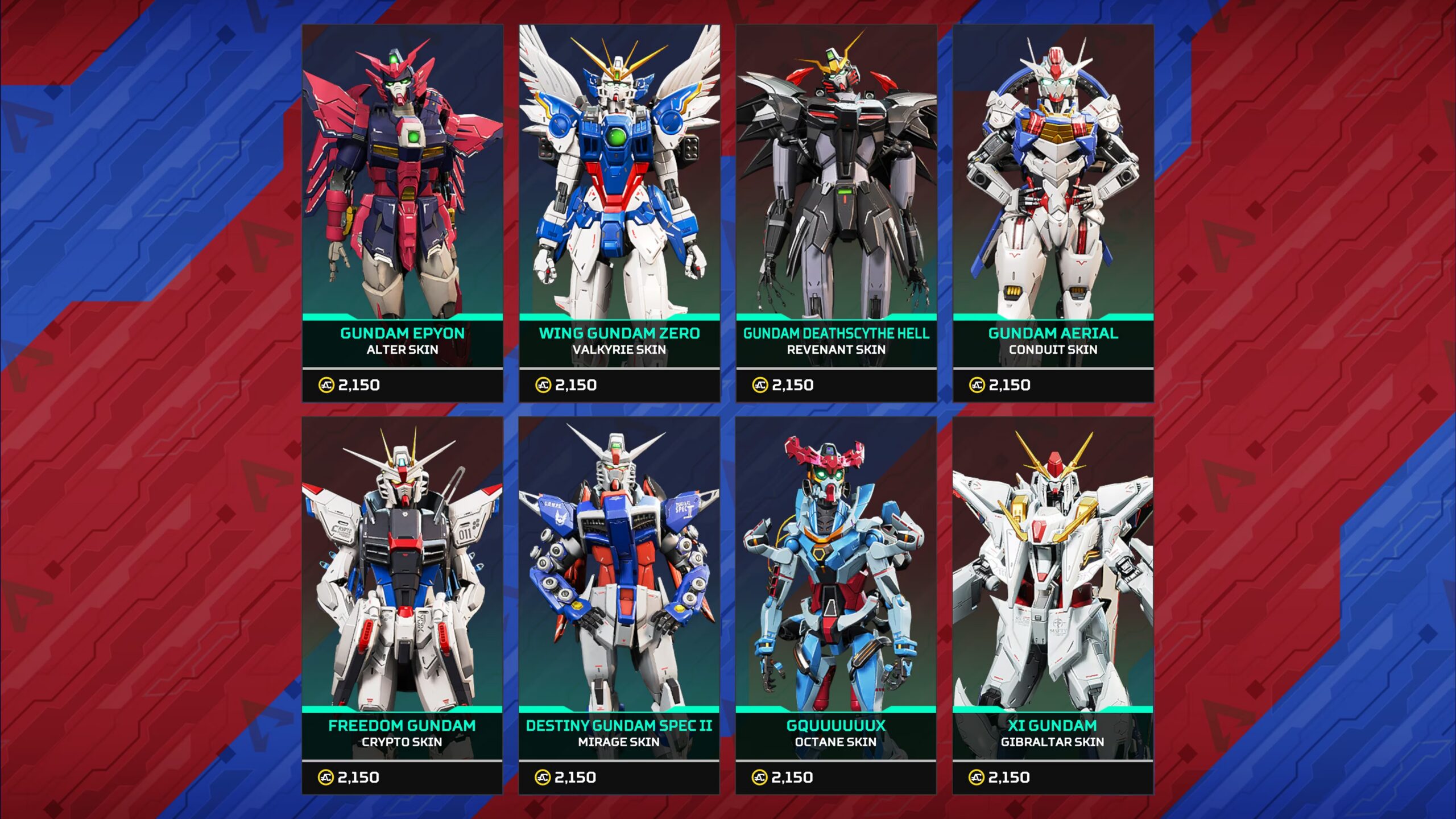 8人のレジェンド向けに、ガンダムをモチーフにしたスキンをご用意しました。それぞれのスキンはレジェンドの個性、プレイスタイル、伝承に合わせて調整されています。