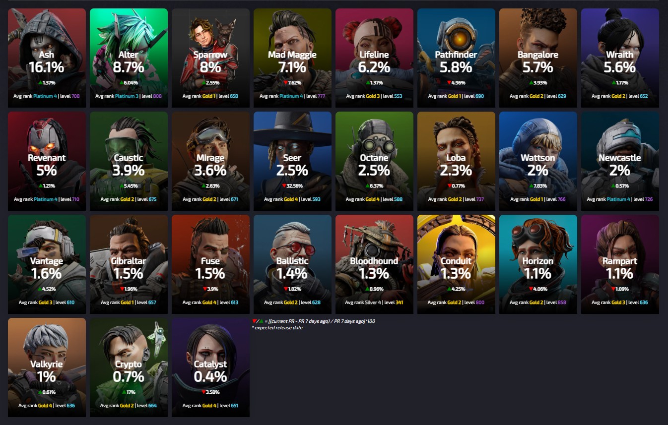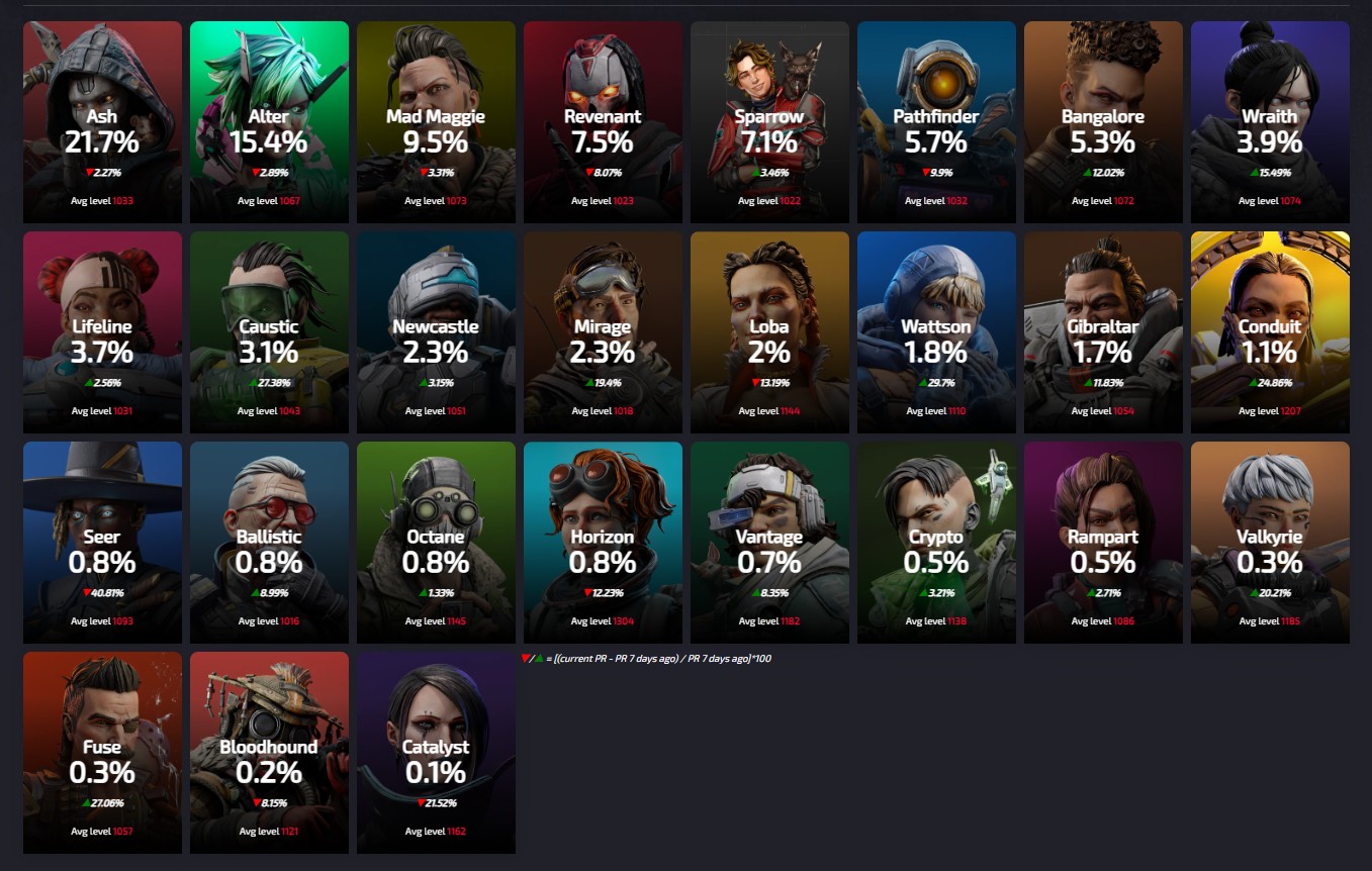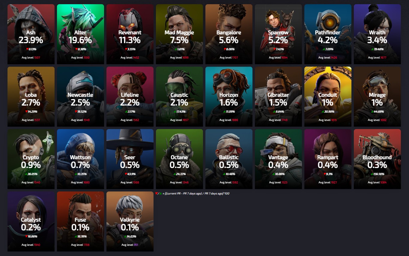Apexlegendsstatus.comによると約3090万人のプレイヤーによって基づいている『レジェンドの使用率』は現在の下記の様になっているとの事です。