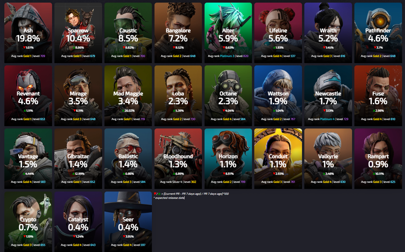 Apexlegendsstatus.comによると約3070万人のプレイヤーによって基づいている『レジェンドの使用率』は現在の下記の様になっているとの事です。