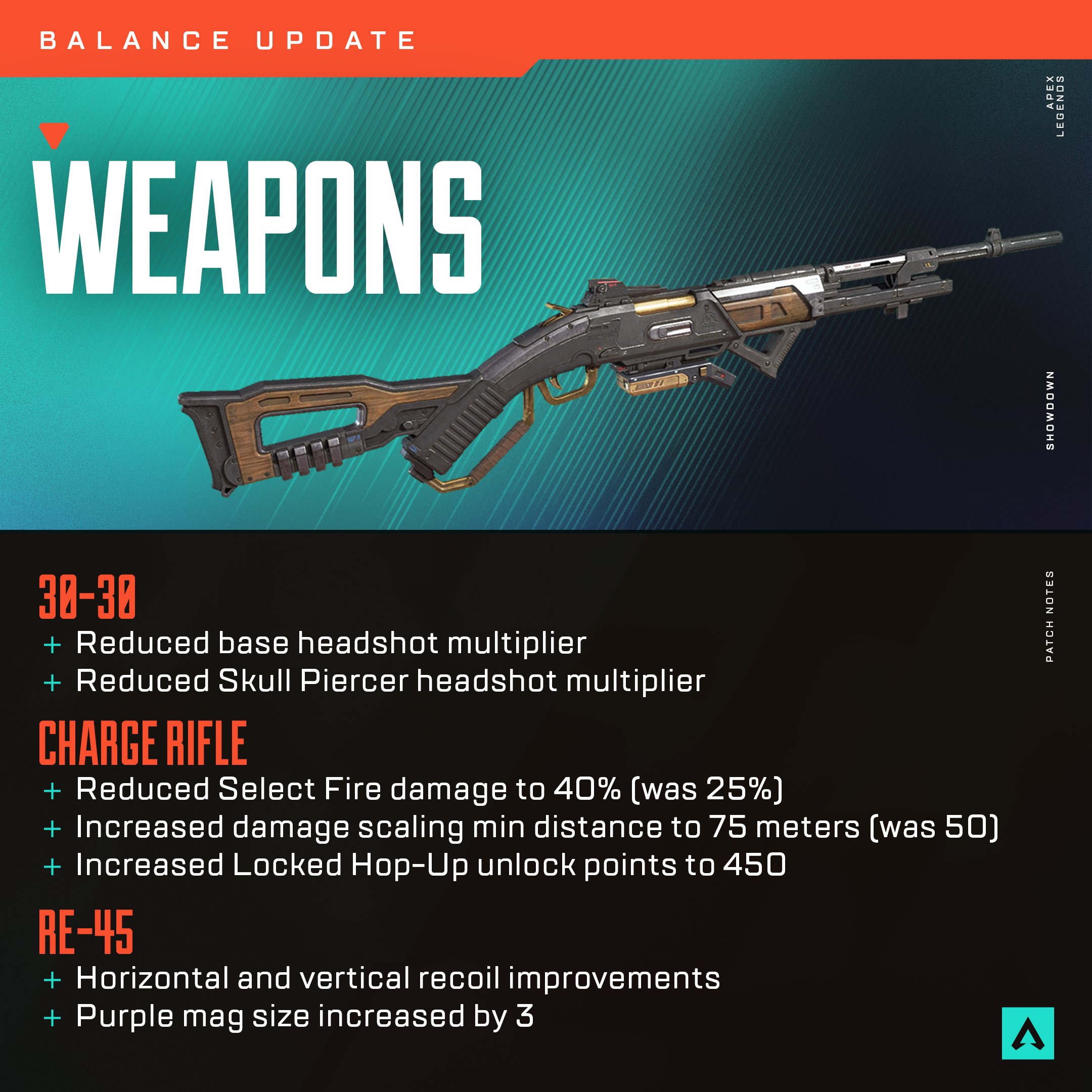 We're rolling out a few more balance changes to weapons today. Our most recent changes to the RE-45 nerfed it a bit more than we liked. So, we've adjusted it to be a bit stronger, but not as strong as the original release. We've also made changes to the Charge Rifle and 30-30. pic.twitter.com/AOhmyLIgS3