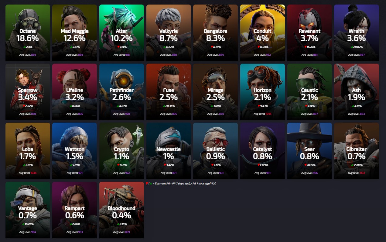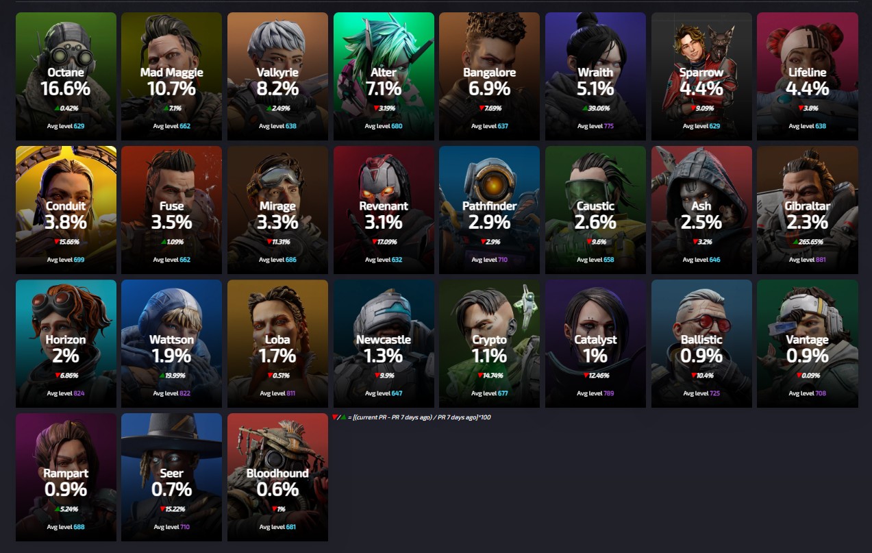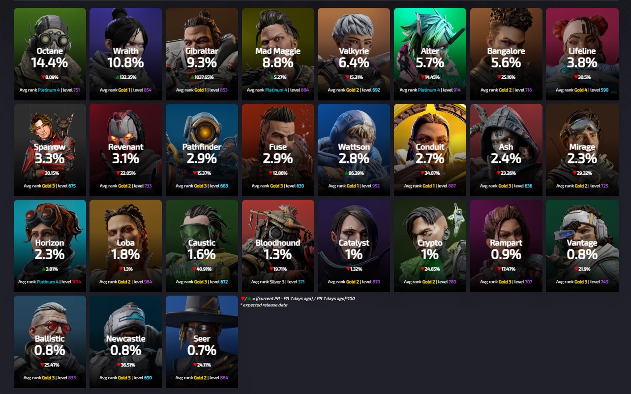 Apexlegendsstatus.comによると約3220万人のプレイヤーによって基づいている『レジェンドの使用率』は現在の下記の様になっているとの事です。