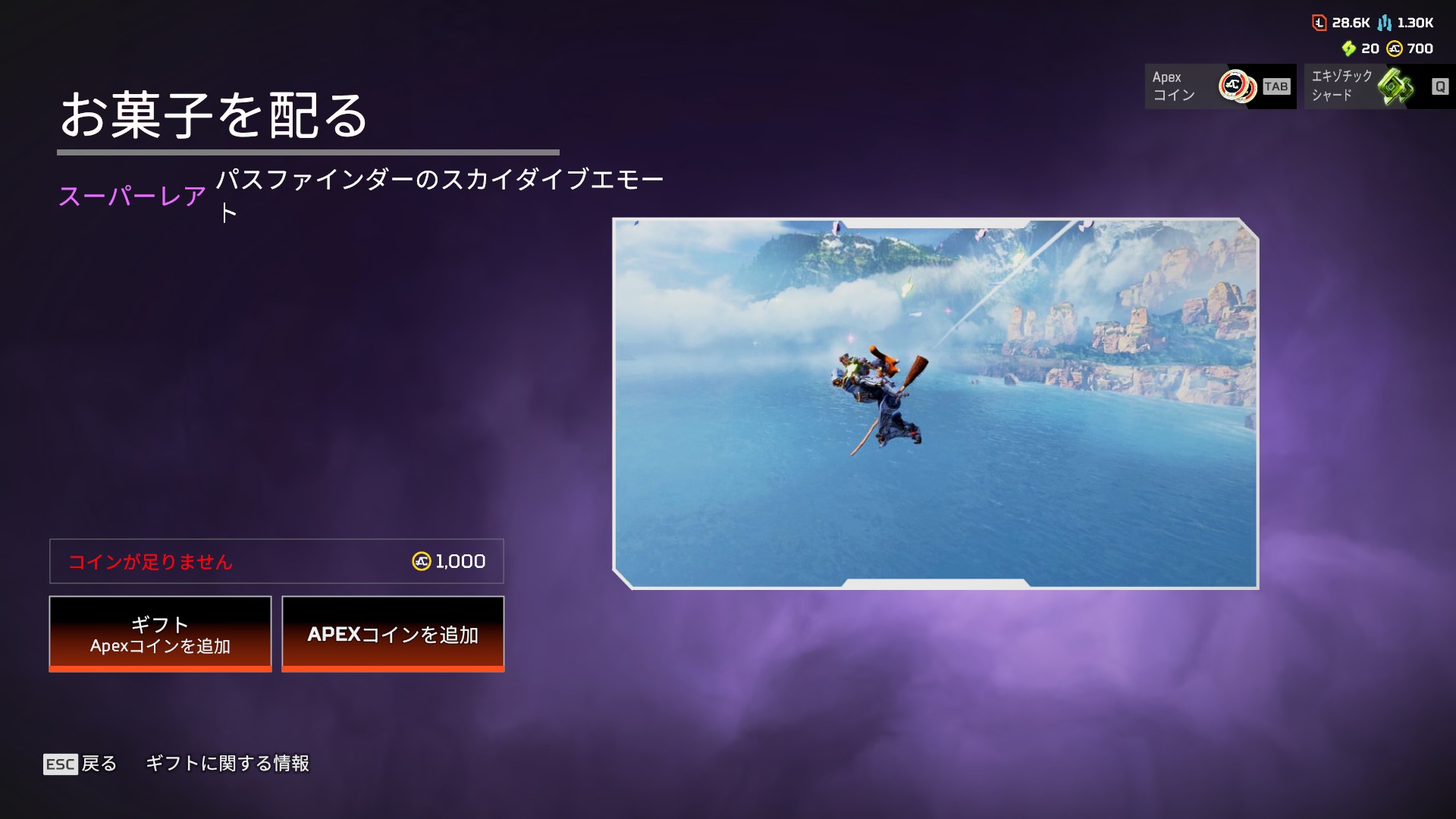 パスファインダーのスカイダイブエモート「お菓子を配る」