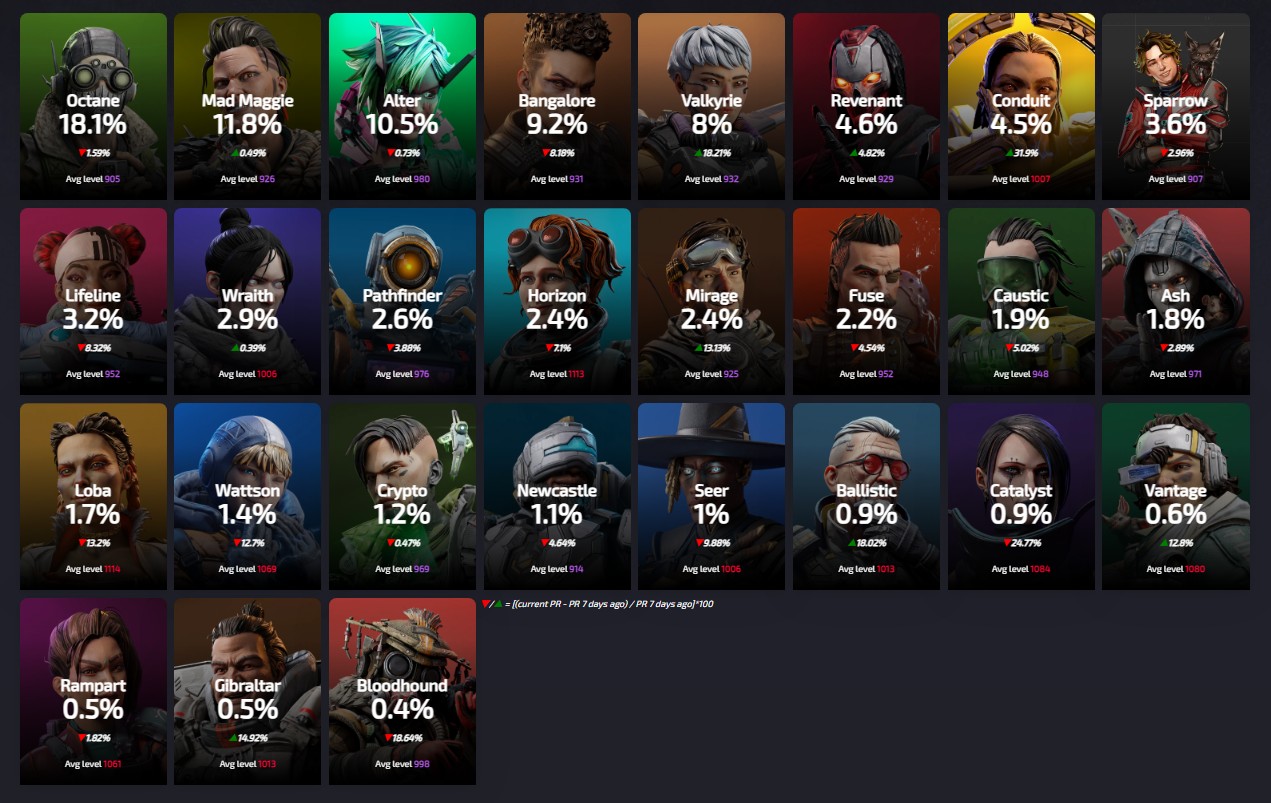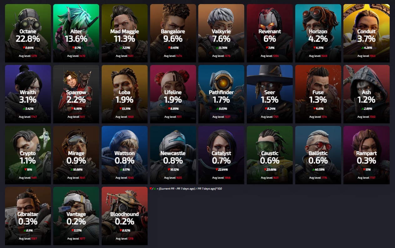 Apexlegendsstatus.comによると約3220万人のプレイヤーによって基づいている『レジェンドの使用率』は現在の下記の様になっているとの事です。