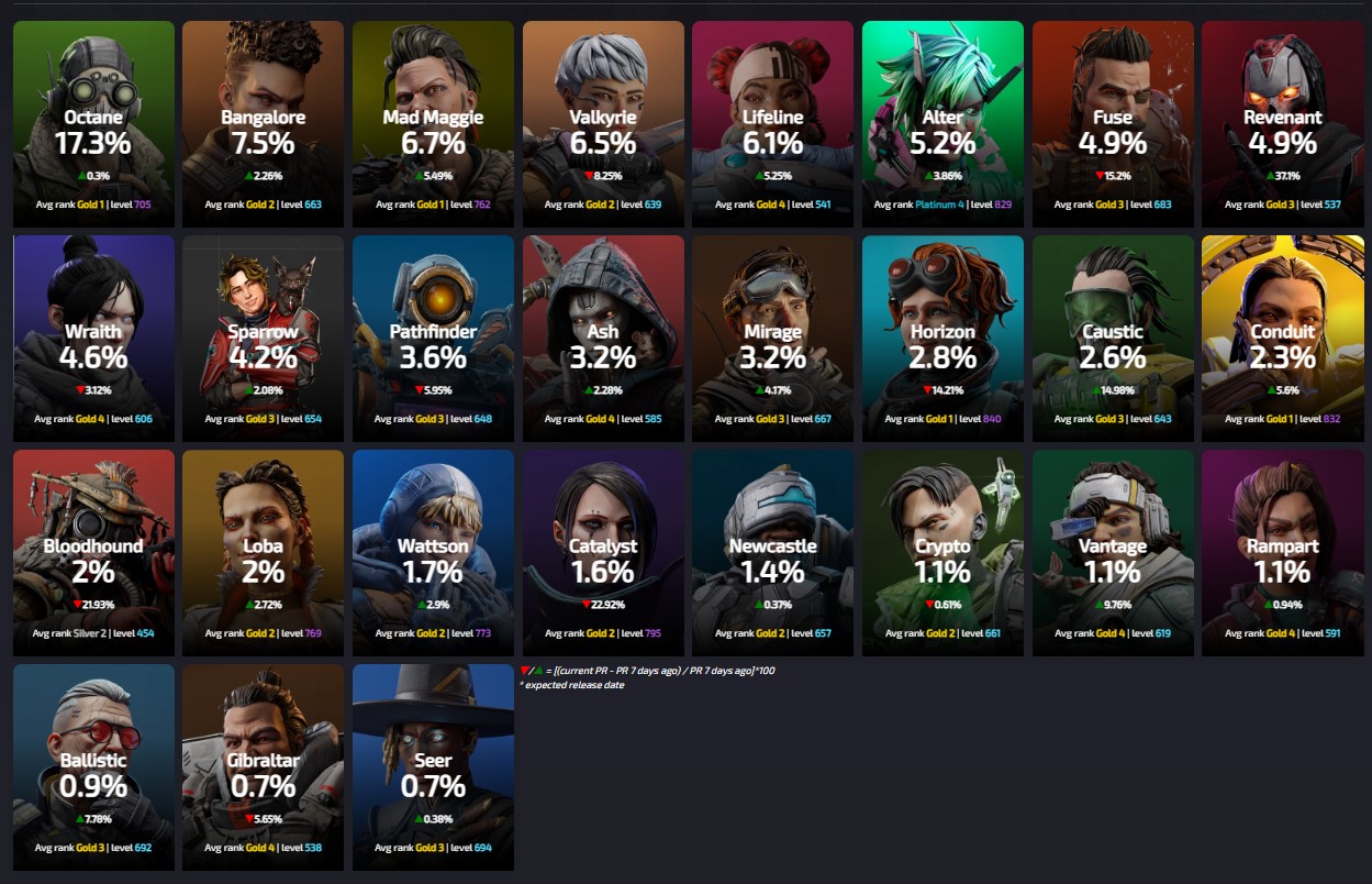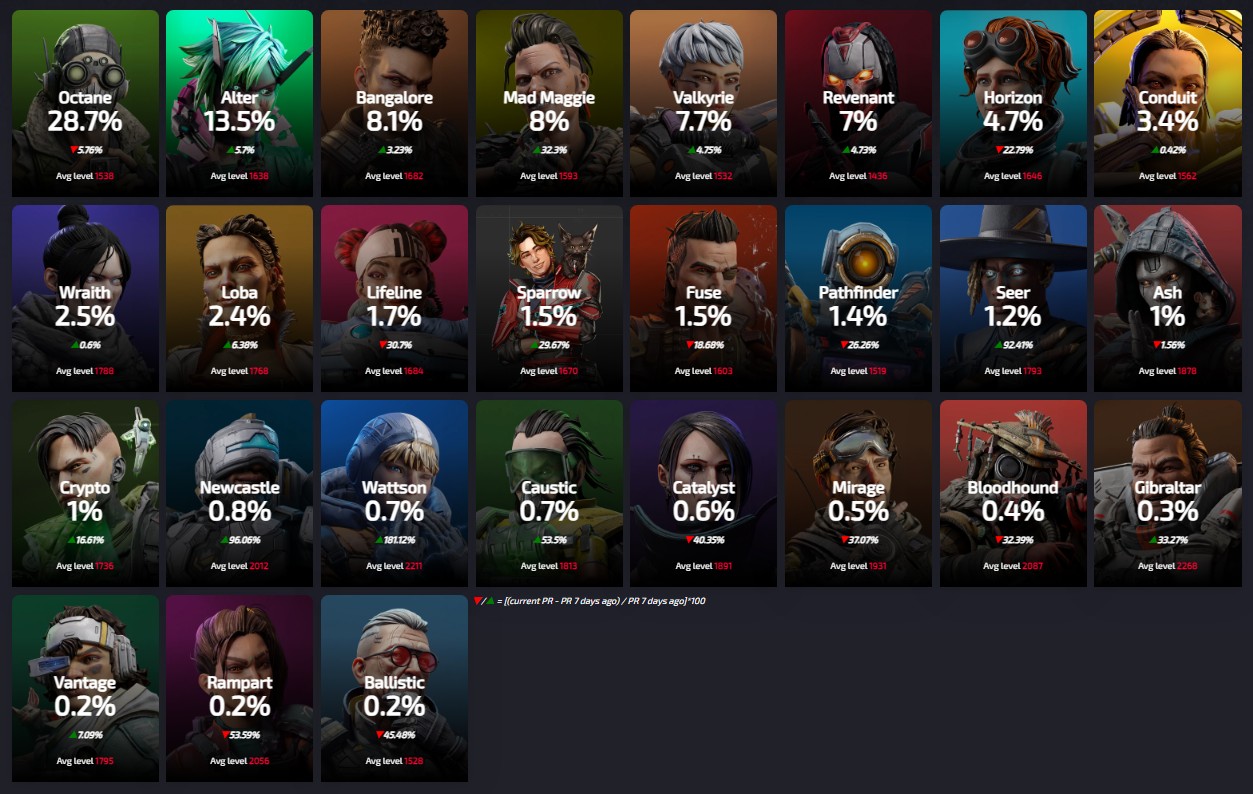 Apexlegendsstatus.comによると約3220万人のプレイヤーによって基づいている『レジェンドの使用率』は現在の下記の様になっているとの事です。