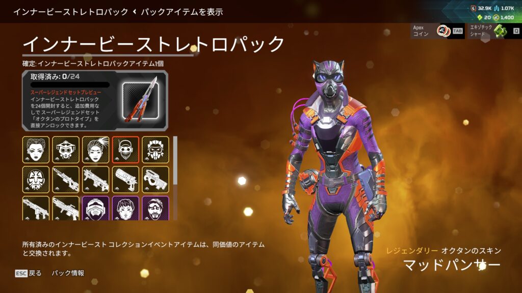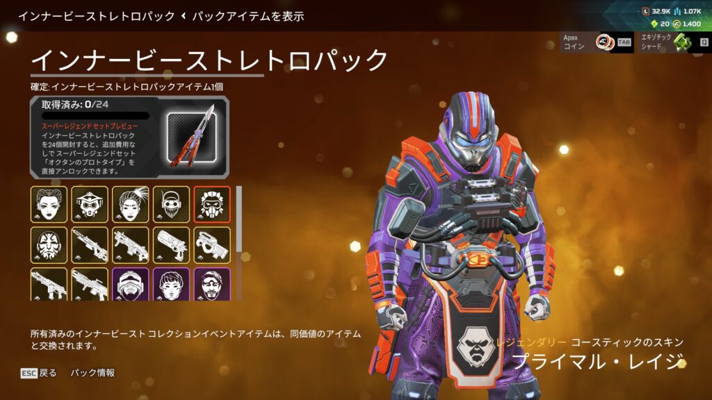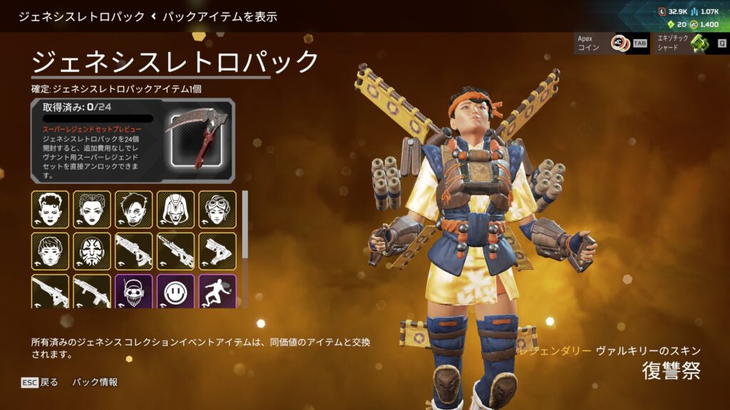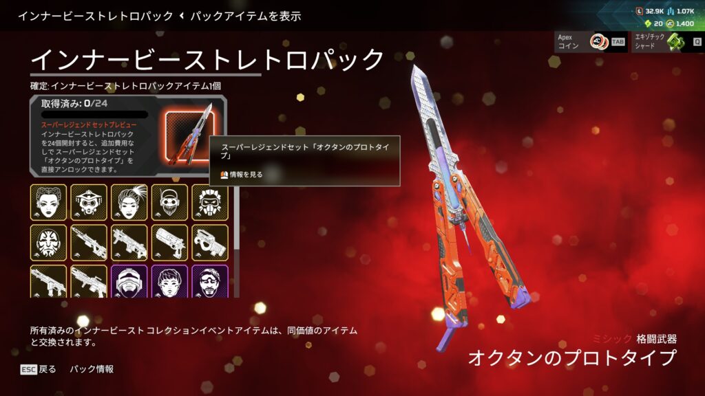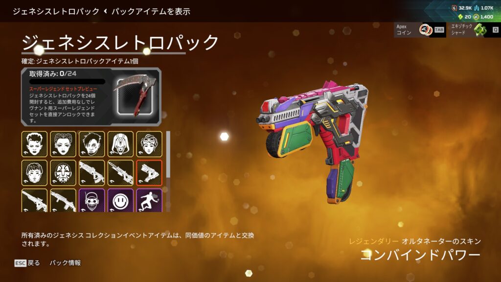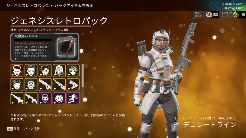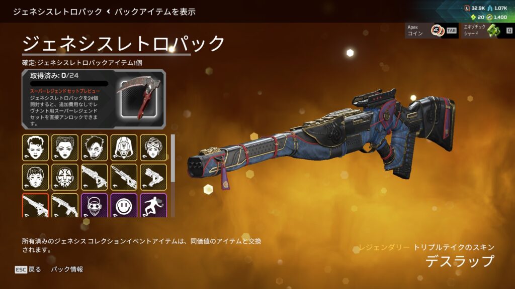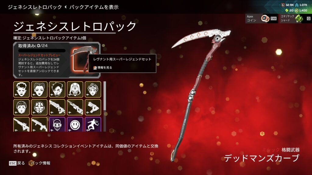 過去に開催されたコレクションイベントのアイテムが入手可能なパックで、コンプリートするとレヴナント&オクタン(色違い)のスパレジェが入手可能になっています。