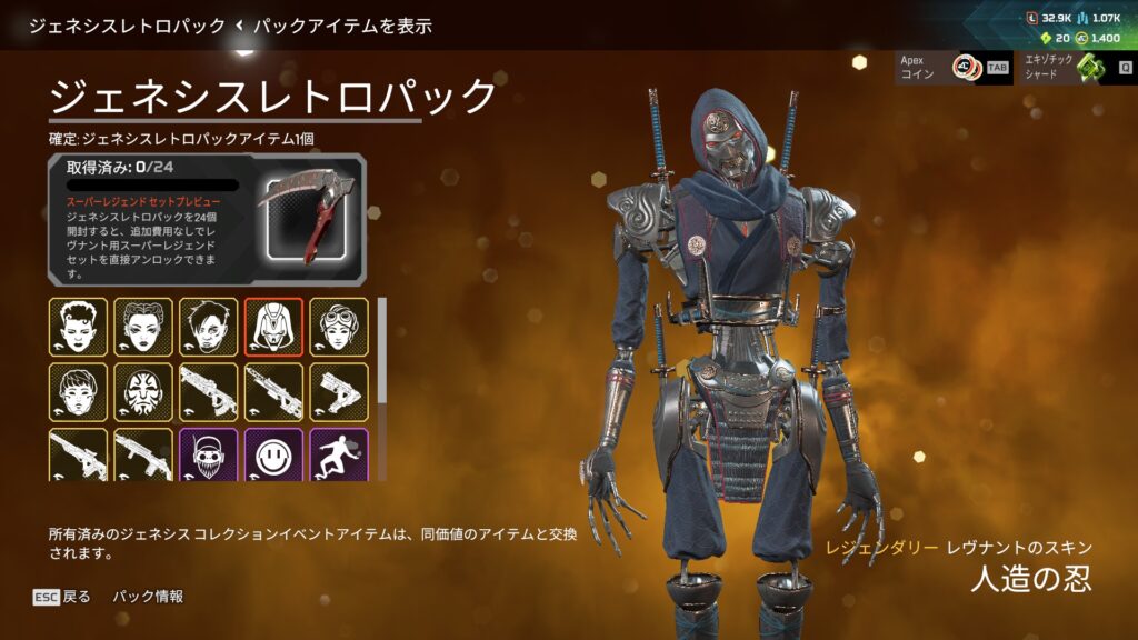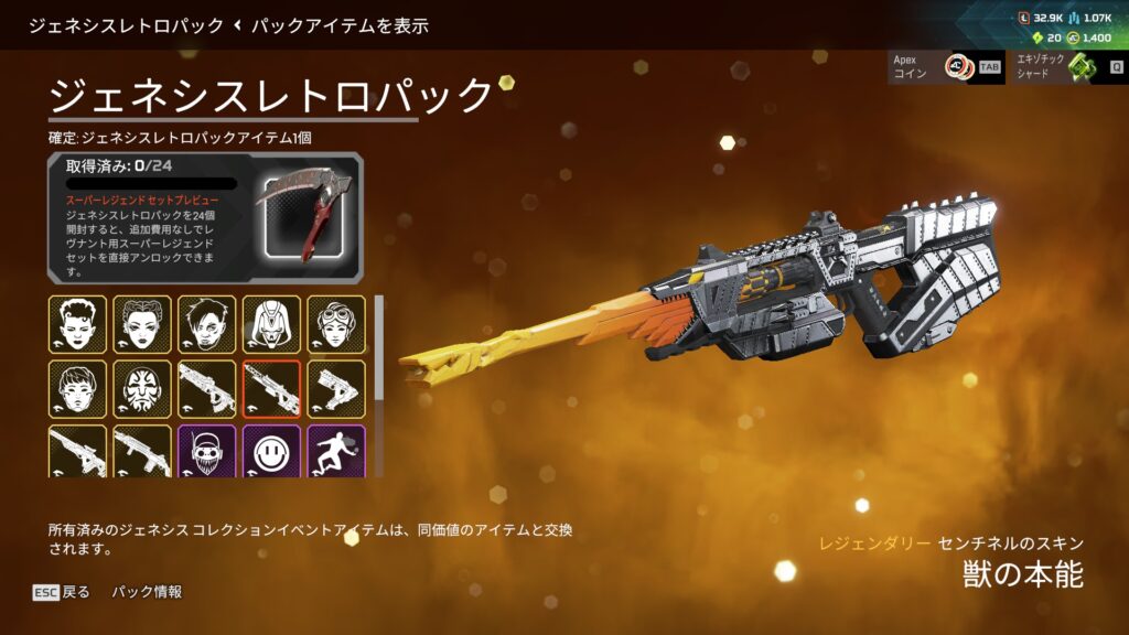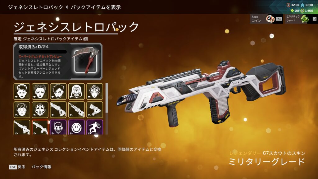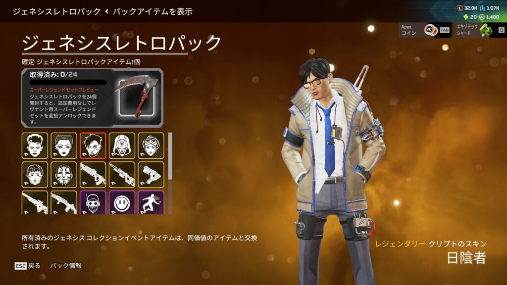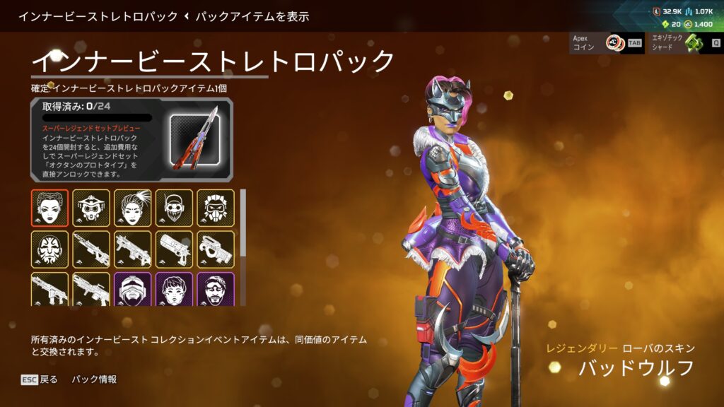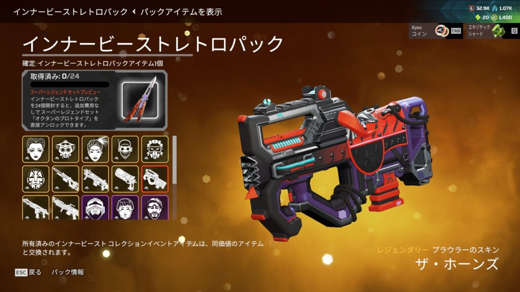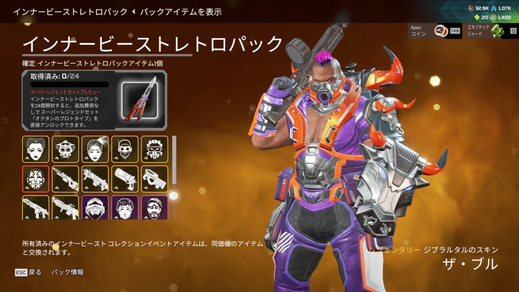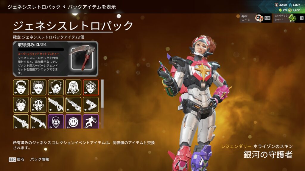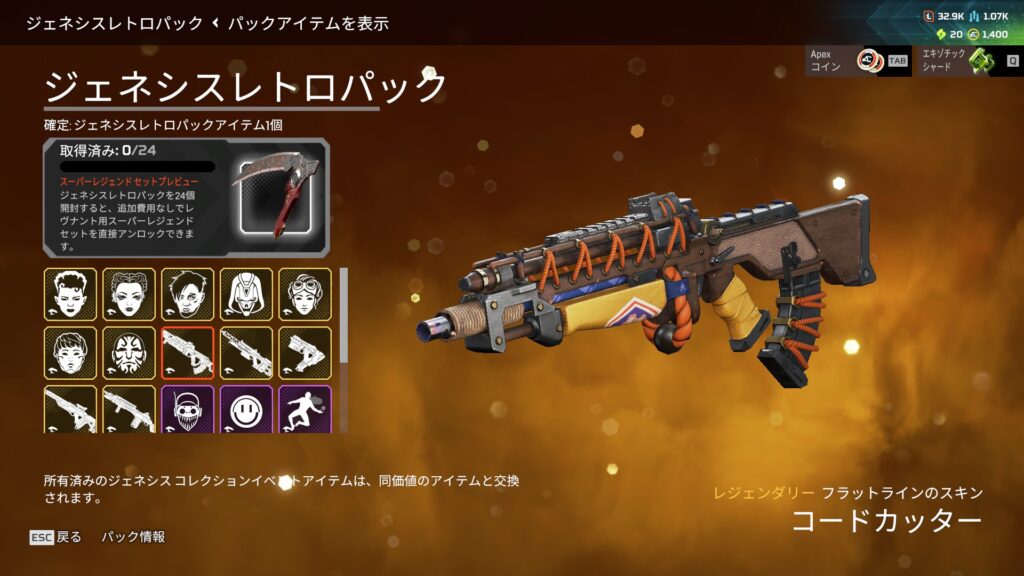 過去に開催されたコレクションイベントのアイテムが入手可能なパックで、コンプリートするとレヴナント&オクタン(色違い)のスパレジェが入手可能になっています。