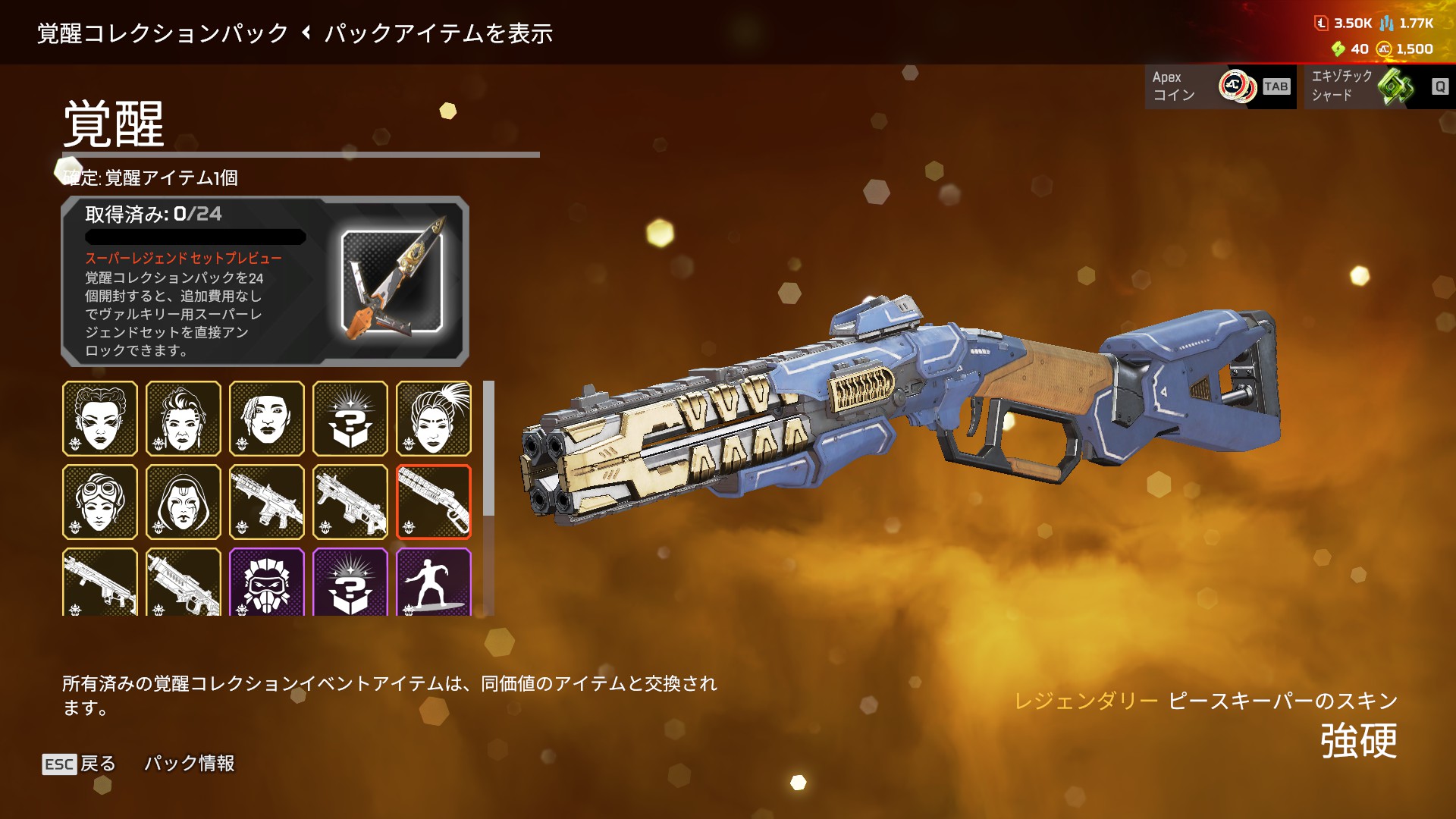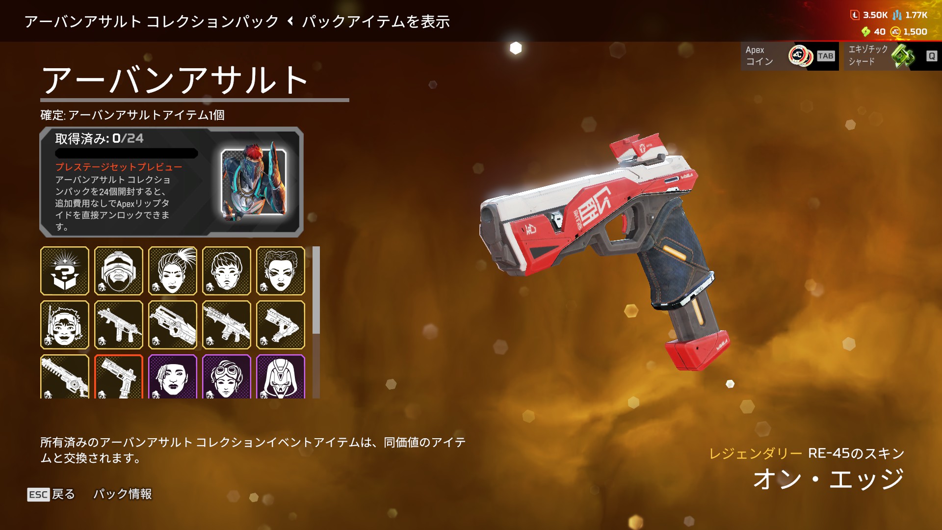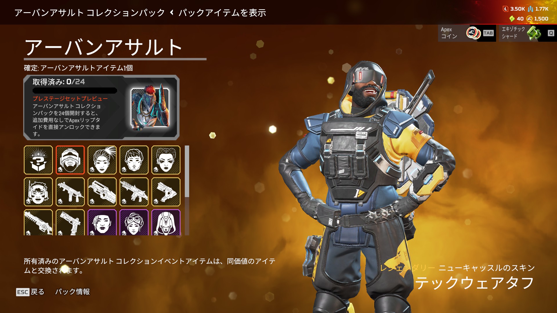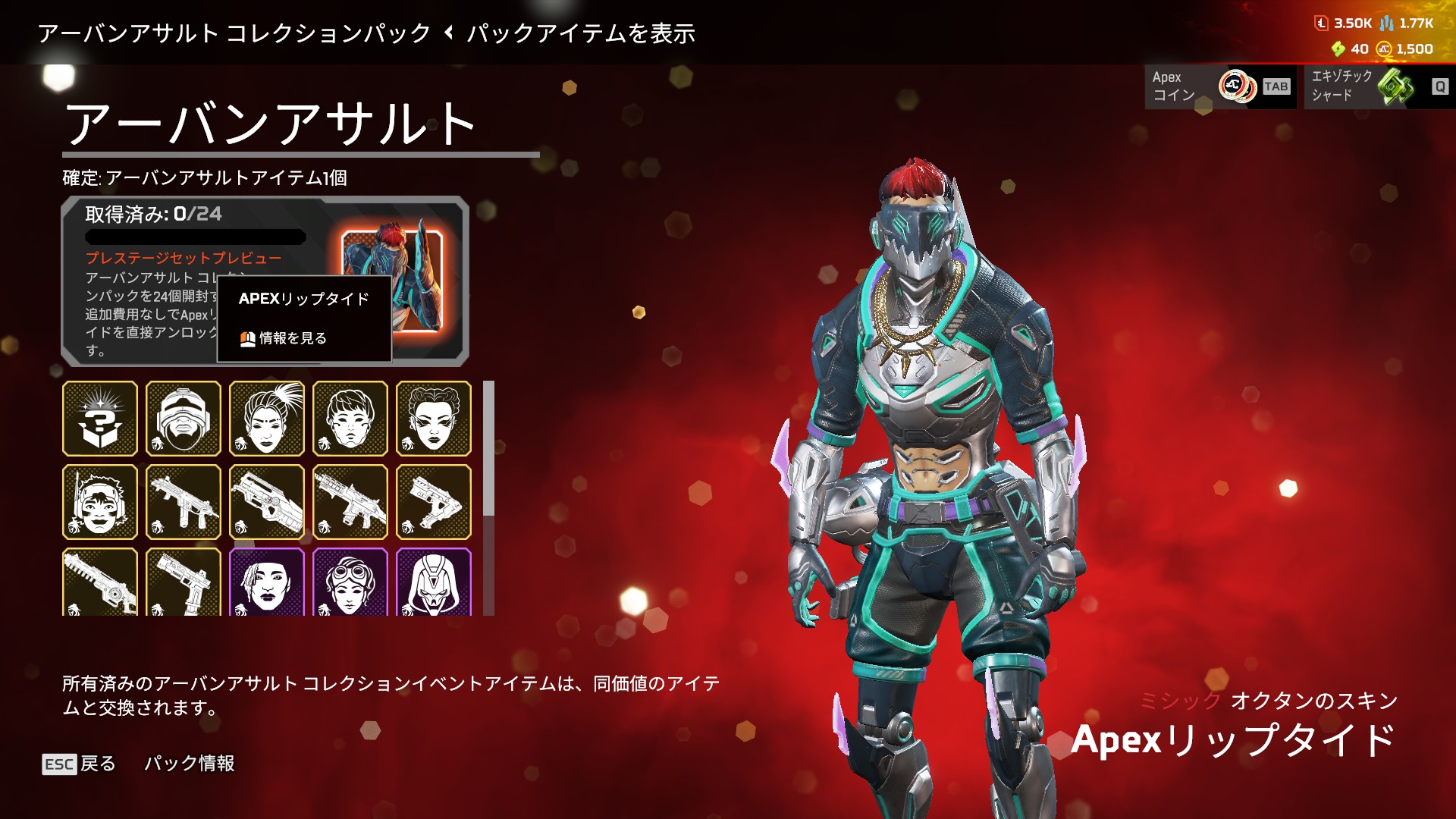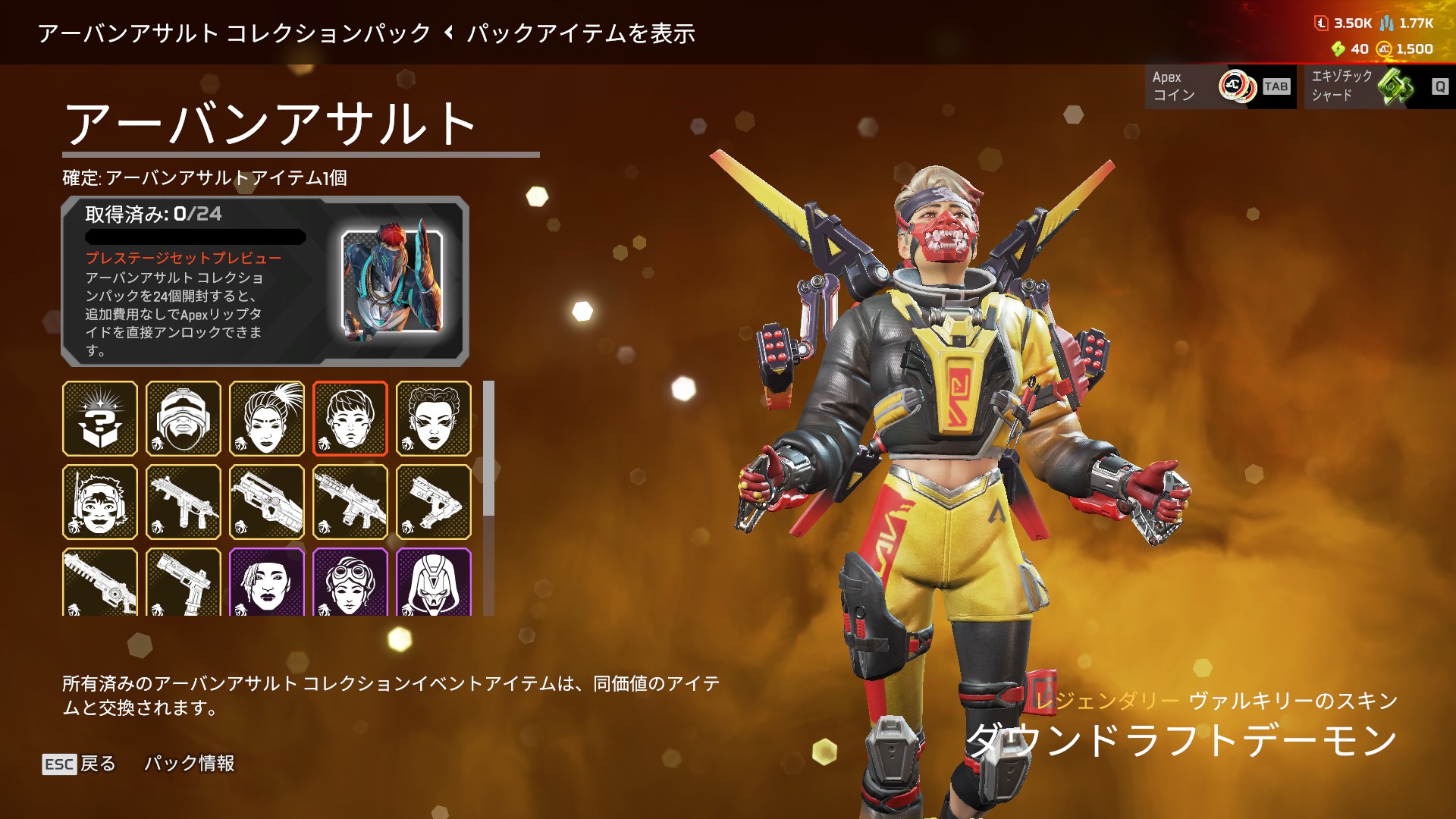 過去に開催されたコレクションイベントのアイテムが入手可能なパックで、コンプリートするとオクタンのプレステージスキン&ヴァルキリーのスパレジェが入手可能になっています。