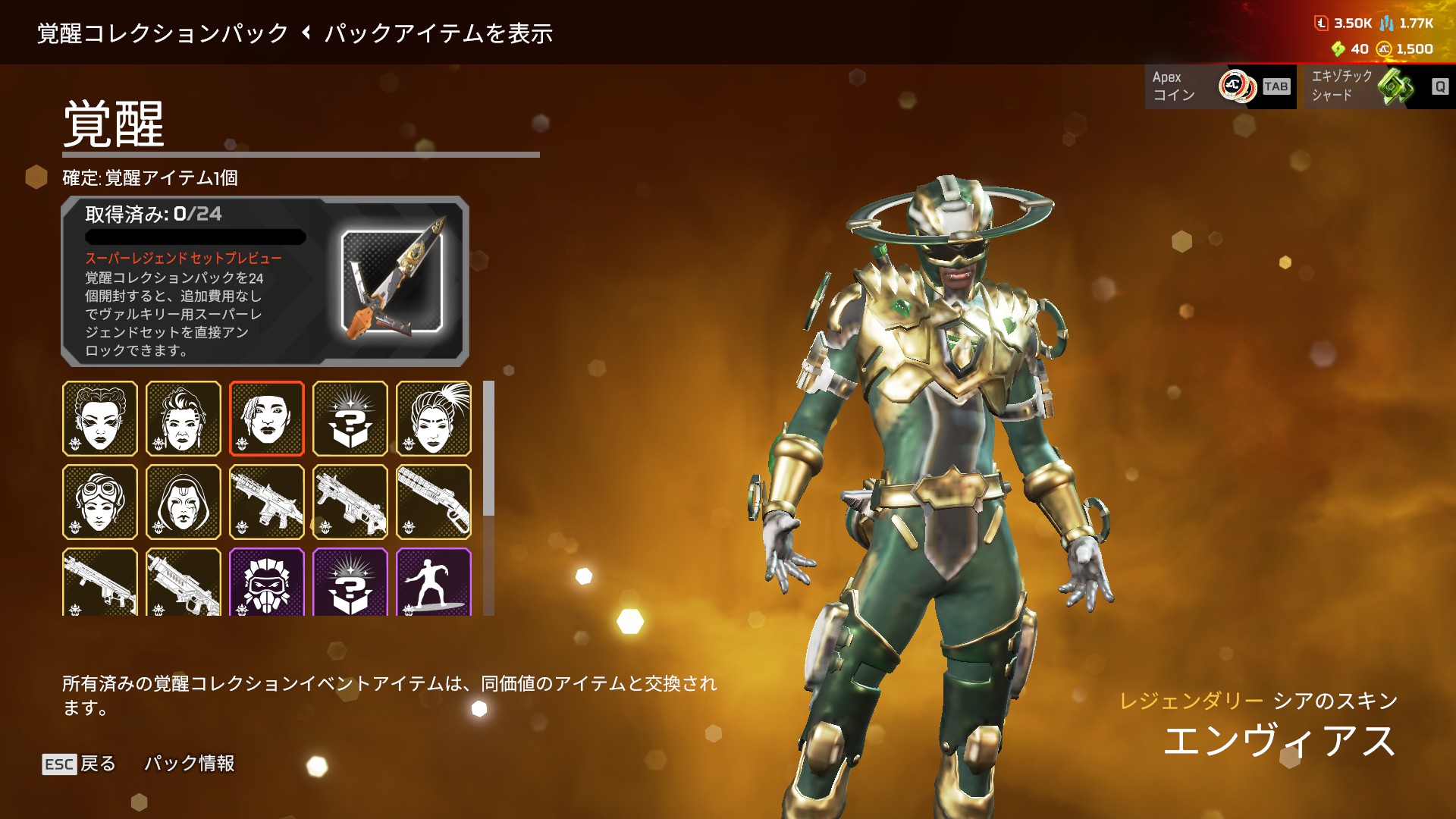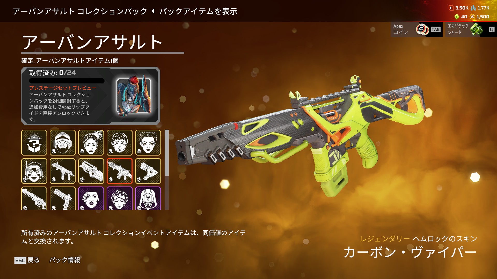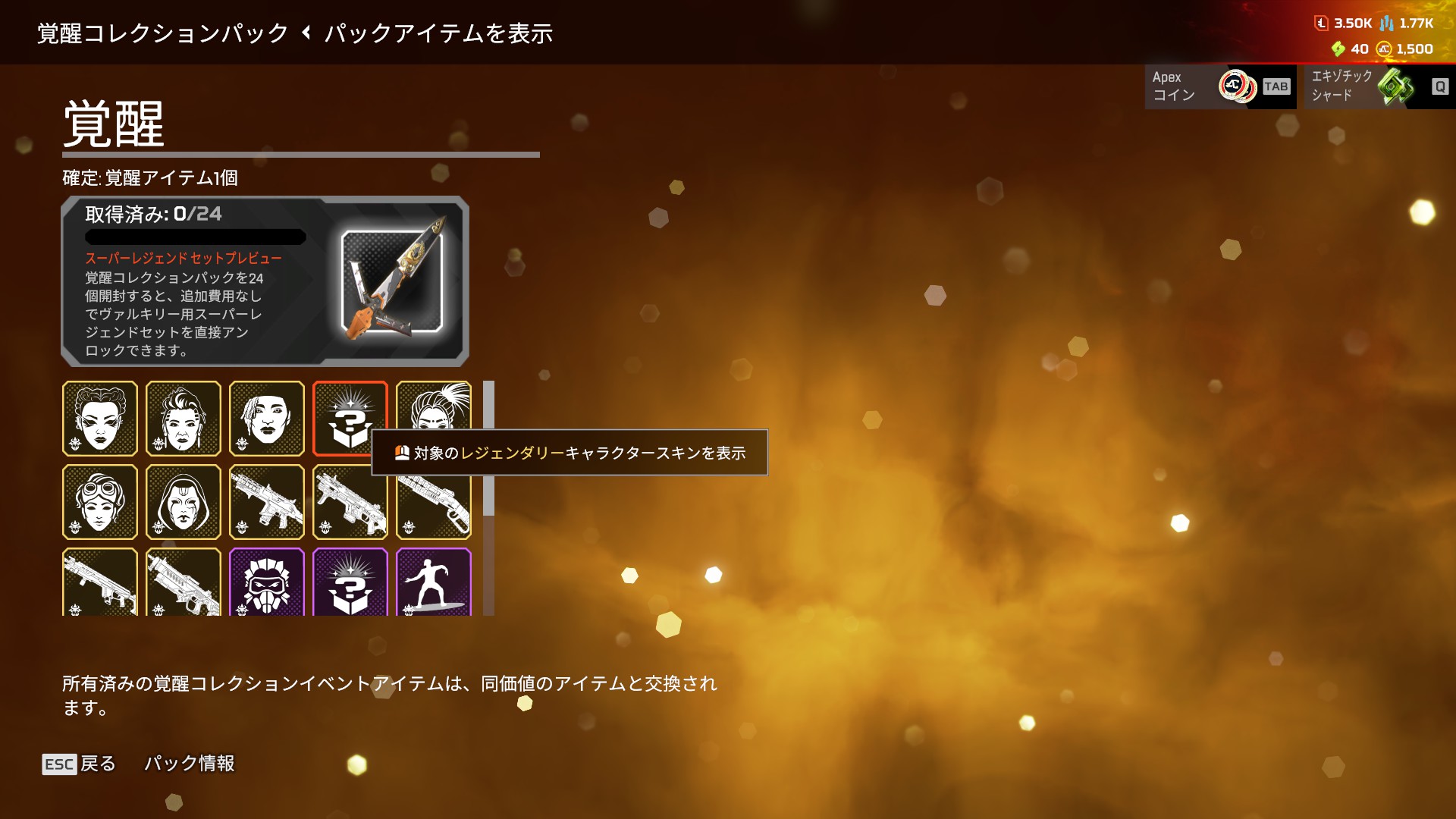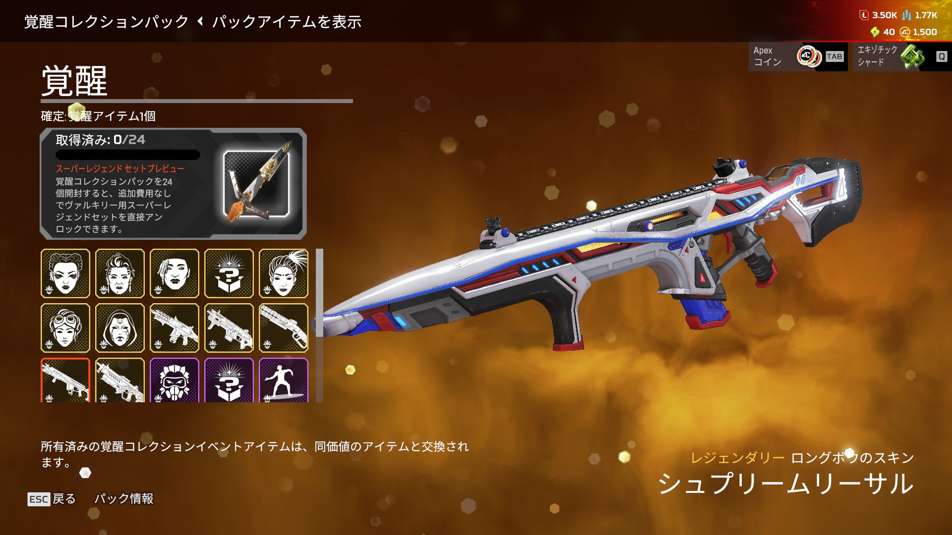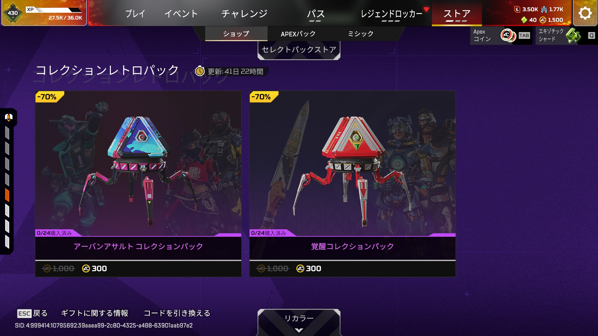 過去に開催されたコレクションイベントのアイテムが入手可能なパックで、コンプリートするとオクタンのプレステージスキン&ヴァルキリーのスパレジェが入手可能になっています。