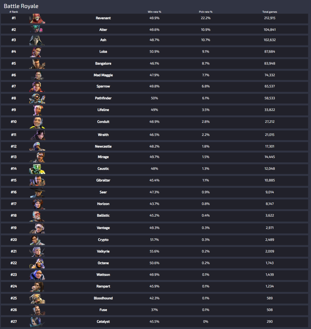 Apexlegendsstatus.comによると、各プラットフォーム上位100人のプレイヤーの戦績に基づいている『レジェンドの勝率』は現在の下記の様になっているとの事です。